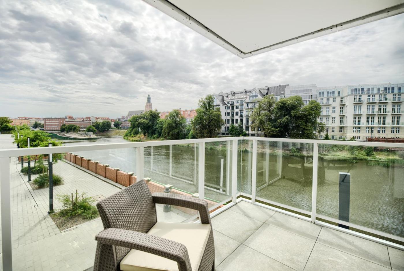 Apartament z balkonem. Ten apartament z prywatnym wejściem mieści salon, oddzielną sypialnię oraz łazienkę z prysznicem typu walk-in i suszarką do włosów. Posiłki można przygotowywać w kuchni z płytą kuchenną, lodówką, zmywarką do naczyń oraz przyborami kuchennymi. Dodatkowe udogodnienia w apartamencie to balkon z widokiem na rzekę, pralka oraz telewizor z płaskim ekranem. W tej opcji zakwaterowania dostępne są 2 łóżka. Apartament - 4 osobowy. Powierzchnia pokoju ok.: 40 mkw. ;